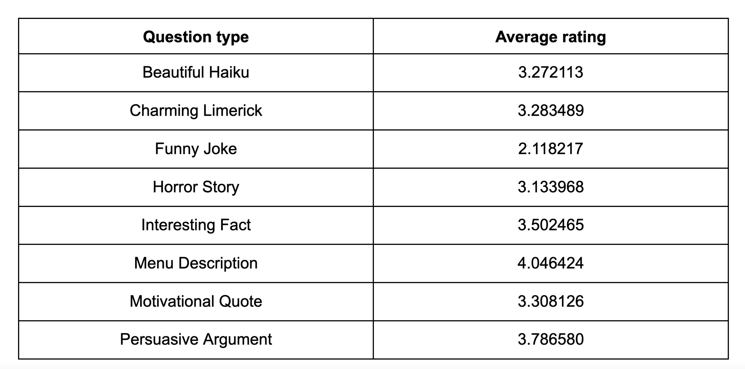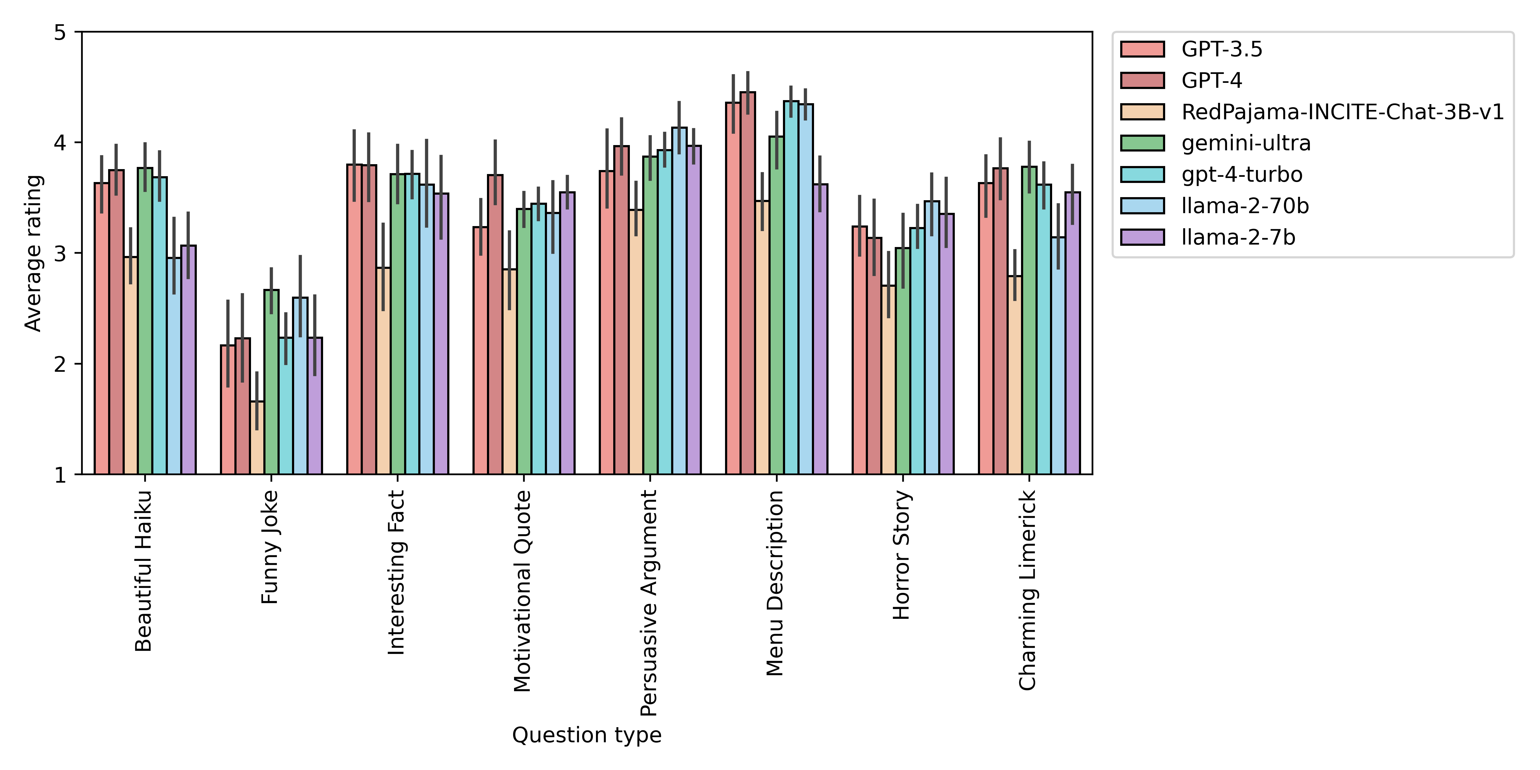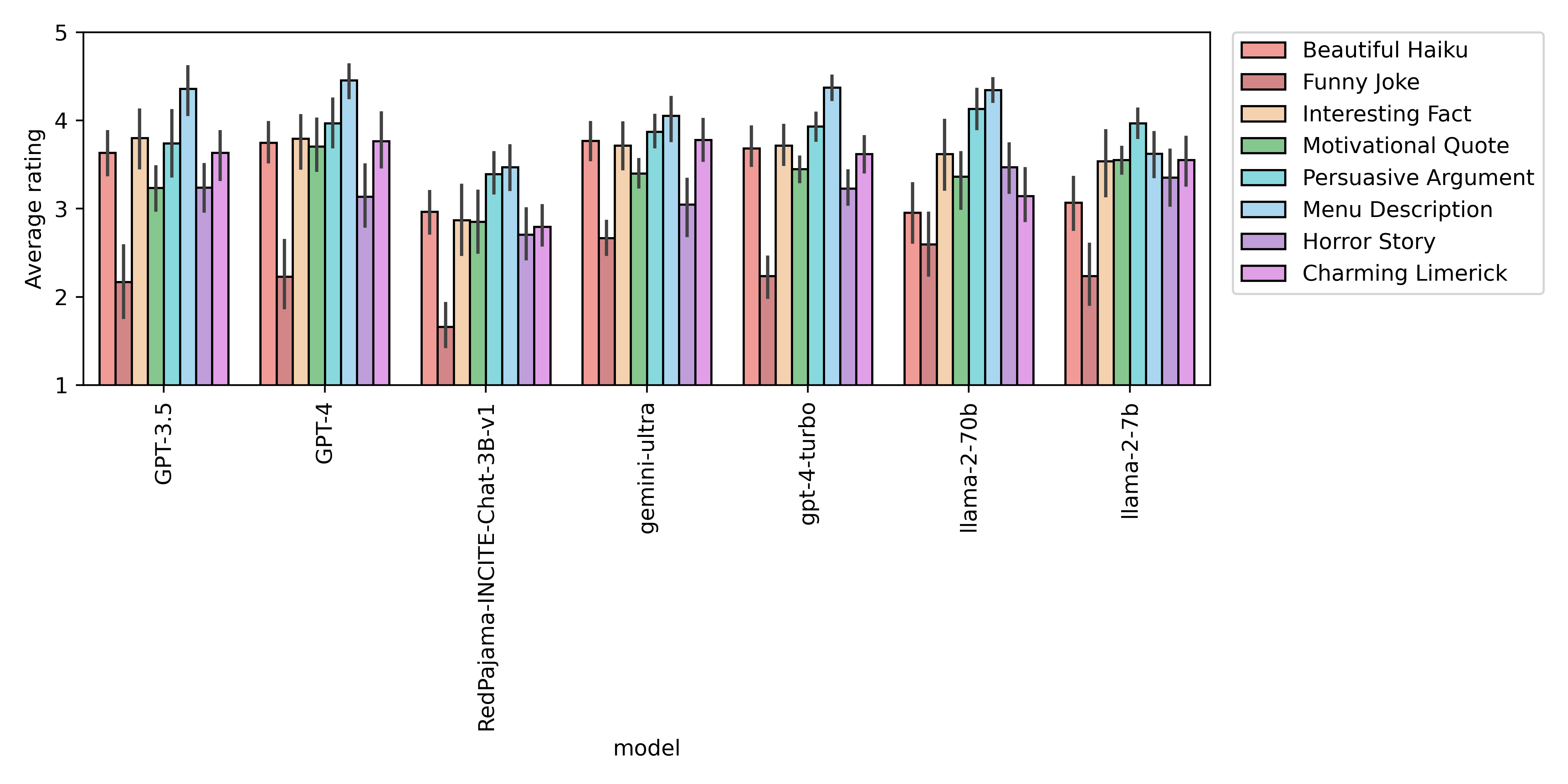 We found that, on average, models performed worst at telling funny jokes, and best at writing appetizing descriptions of food.