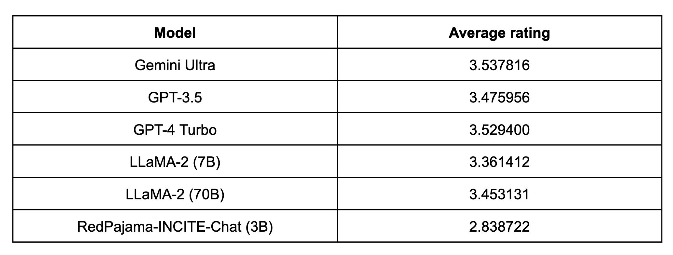 Soon, we’ll be releasing our own models, but given the recent release of Gemini Ultra, we were curious how the most advanced LLMs would perform. We’ve tested GPT-4 Turbo, Gemini Ultra, and LLaMa 70b, and, for comparison, a few smaller language models like RedPajama-INCITE-Chat-3B. (As a caveat, it’s worth noting that we collected Gemini Ultra responses through Google’s chat interface, which may have access to auxiliary tools such as web search.)
